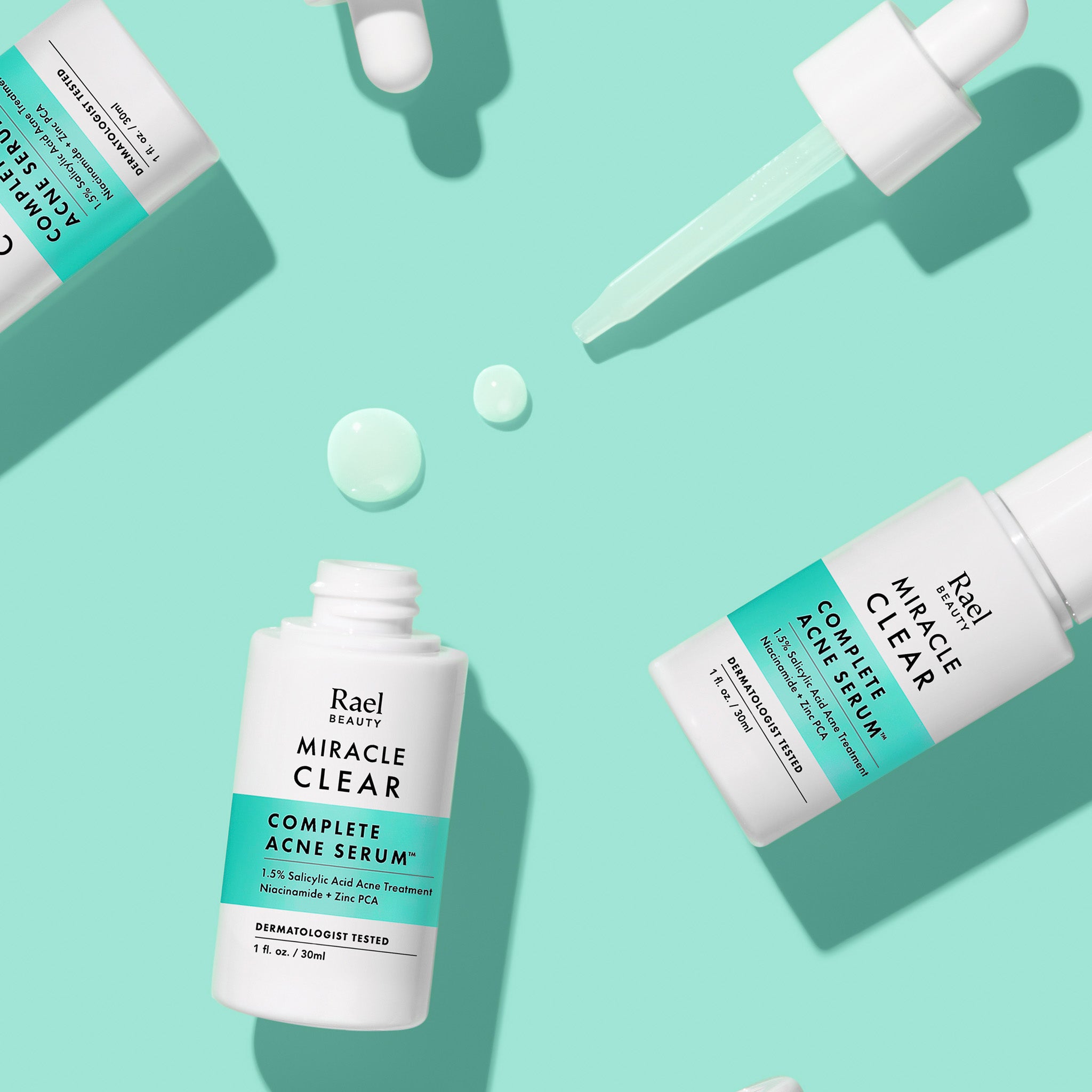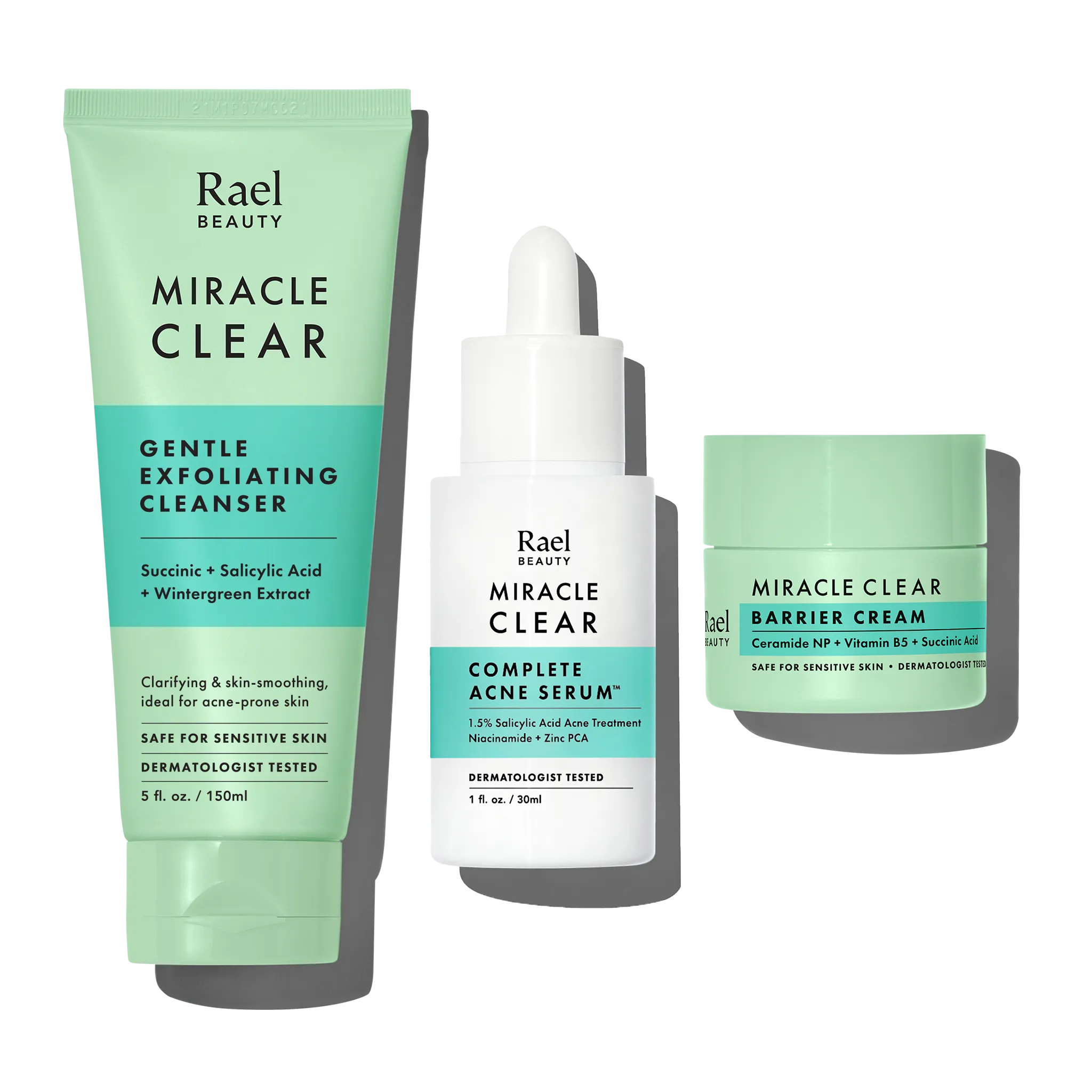 Meet the NEW Miracle Clear Trio – three simple daily steps to help support clearer-looking, healthier skin. The Gentle Exfoliating Cleanser washes away buildup and excess oil without stripping the skin. Follow with the Complete Acne Serum, a treatment designed to target acne in all stages. Finish with the Barrier Cream, designed to support the skin’s natural moisture barrier and help minimize future surface-level flare-ups. Ideal for sensitive, oily, or blemish-prone skin – especially those with visible congestion or enlarged pores. Dermatologist tested.